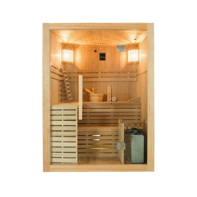 Die Sense-Kabine wird mit vielen traditionellen Geräten geliefert: gedämpfte Leuchten, Pfannenschutz, ergonomische Rückenlehne, Kopfstütze und komplettes Zubehör-Set (Eimer, Zwielichter, Thermometer, Hygrometer, Sanduhr).