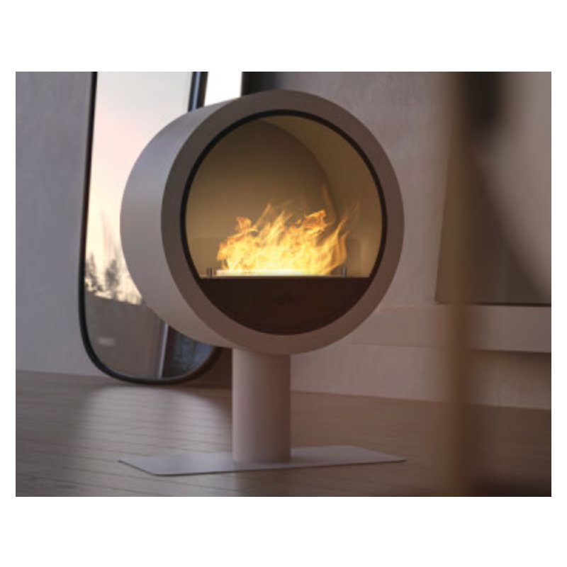 Der Kamin sorgt für einen außergewöhnlichen optischen Effekt, der dank seiner runden Form mit seinem Wandaufhängesystem in jedem Interieur installiert werden kann. Der an der Wand montierte Kamin lässt sich bei einem Wohnungswechsel leicht bewegen.
