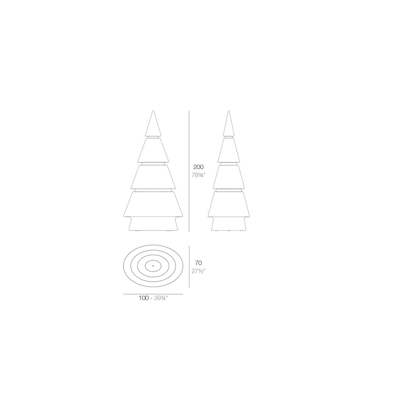 Der Designer Ramón Esteve entwarf den Waldlichterbaum für die Marke Vondom. Durch seine reinen und geometrischen Linien ist der Waldbaum eine zeitgemäße Neufassung des Weihnachtsbaums. Die Nüchternheit und Eleganz seines Designs schaffen eine zeitlose Harmonie, unabhängig vom Stil Ihrer Umgebung. Ausgestattet mit einem weißen LED- oder RGBW-LED-Beleuchtungssystem (Lichtfarbvariation dank der mitgelieferten Fernbedienung) erzeugt der Waldbaum ein weiches und umhüllendes Umgebungslicht. Er ist in vier verschiedenen Größen erhältlich und eignet sich ideal für ein Unternehmen, ein Restaurant, ein High-End-Hotel oder sogar für Ihr modernes Zuhause. Es ist sehr widerstandsfähig gegen Stöße und schlechtes Wetter und ist für den Innen- und Außenbereich bei allen Wetterbedingungen konzipiert. Es hält Schnee, Kälte, Temperaturschwankungen (auch Extreme: -60°C bis +80°C), Sonne und Gischt stand. Ein "magischer" Baum, um den einzigartigen Moment der Weihnacht zu feiern.