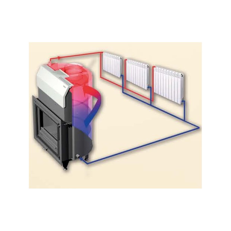 Die Hydro K100 Einsätze müssen immer an einen Hydraulikkreislauf von Heizkörpern oder eine ähnliche Installation angeschlossen werden, da sie speziell für die Beheizung des Raumes mit diesen Elementen ausgelegt sind. Sie sind aber auch eine Wärmequelle durch natürliche Konvektion der Raumluft.