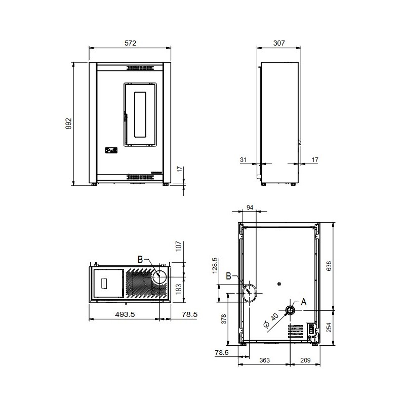 Technische Eigenschaften des belüfteten Pelletofens Luisella 4,8 kW: