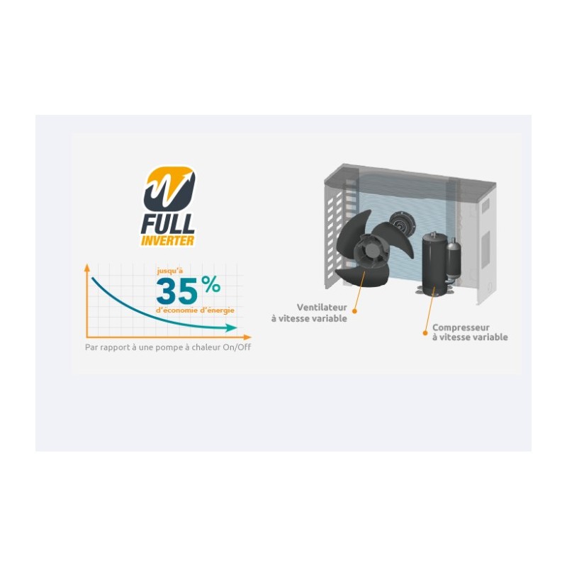 The Full Inverter provides significant energy savings since this type of regime avoids any heating or cooling peaks. The Silent Max is a heat pump that consumes very little energy and is more respectful of the environment.