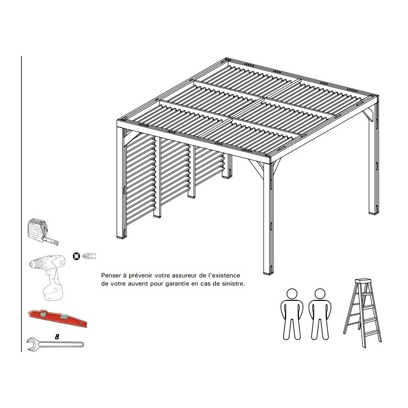 The Pergola comes in kit. The assembly is simplified by a detailed step-by-step editing record. It is advisable to be 2 for editing.