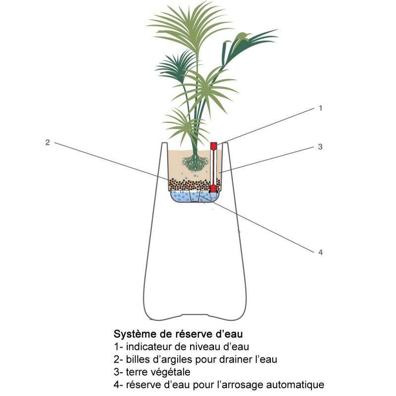 Namely: Model proposed with double wall Available in 10 colors: white, black, bronze, light gray, anthracite, red, pistachio green, orange, pink, champagne (champagne color only available in lacquered finish). Also available in version with self-irrigation system (autonomy up to 3 months), glossy lacquered, bright, LED. Price on request Indoor capacity of the pots: Medium model: 24L - 11gal.