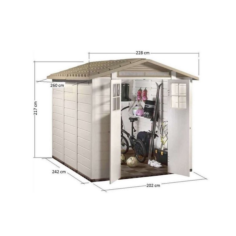 This Evo 240 PVC garden shed of 2.02 m x 2.42 m (4.90 m² ext. on the ground) is intended for outdoor storage.