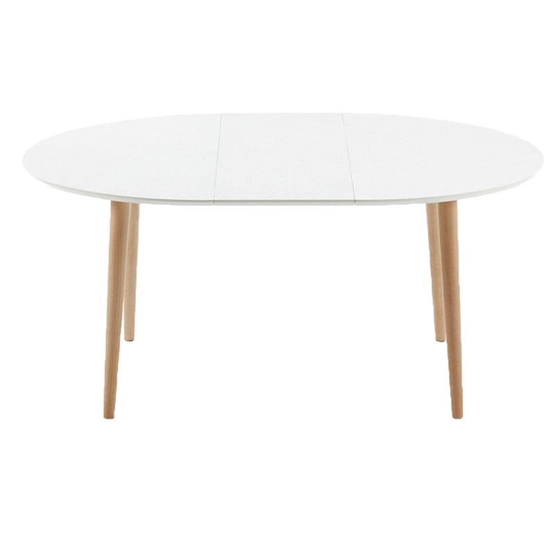 Oval extendable table with top table in matt white lacquered MDF. Feet made of varnished natural beech wood. Maximum length 200 cm. Shop our bag for table extensions and keep them when you don't need them!