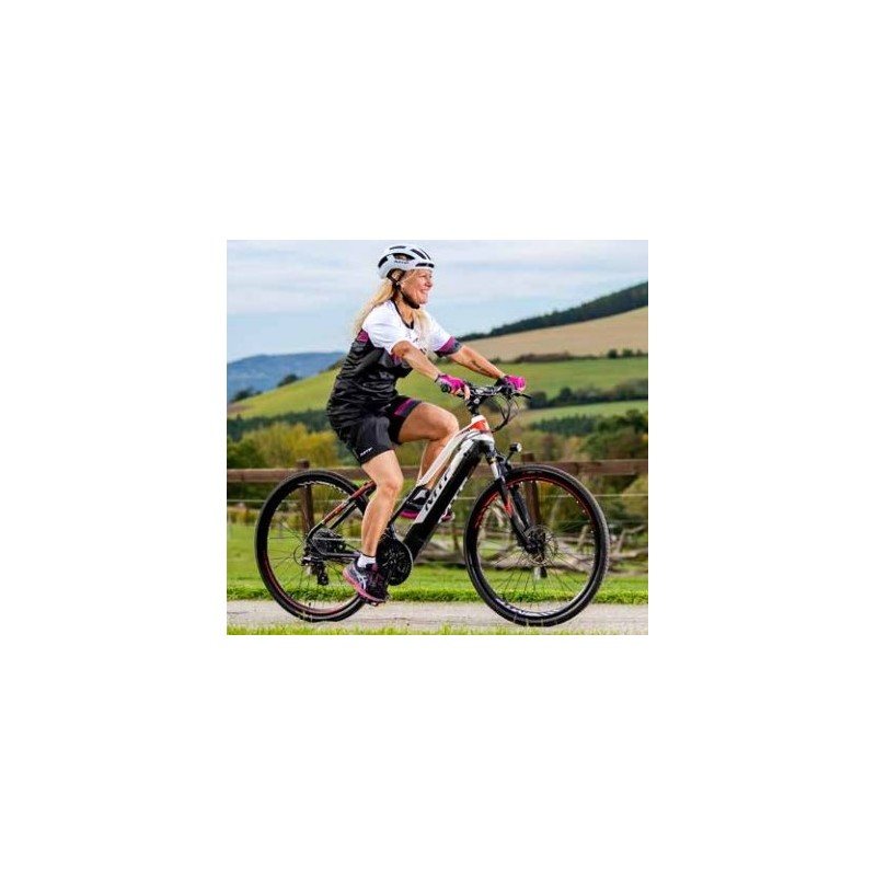 Esta bicicleta de cross para mujer asistida eléctricamente con un tubo de cuadro superior rebajado para facilitar la conducción. Ideal para terrenos ligeros y en carretera, equipado con motor Bafang con batería Samsung. Con cinco modos de pedaleo asistido y una autonomía media de 200 km.
