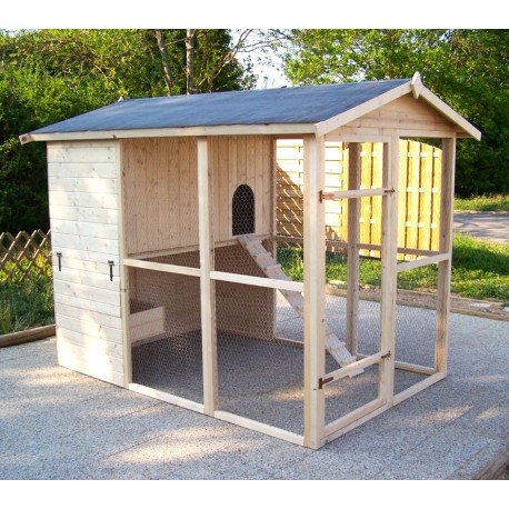 El gallinero de abeto te permite criar De 6 a 10 gallinas. Equipado con un aviario, una zona cerrada para dormir y una caja nido en su interior. Cuenta con una rampa de acceso y una percha. El techo del gallinero está cubierto con fieltro bituminoso.