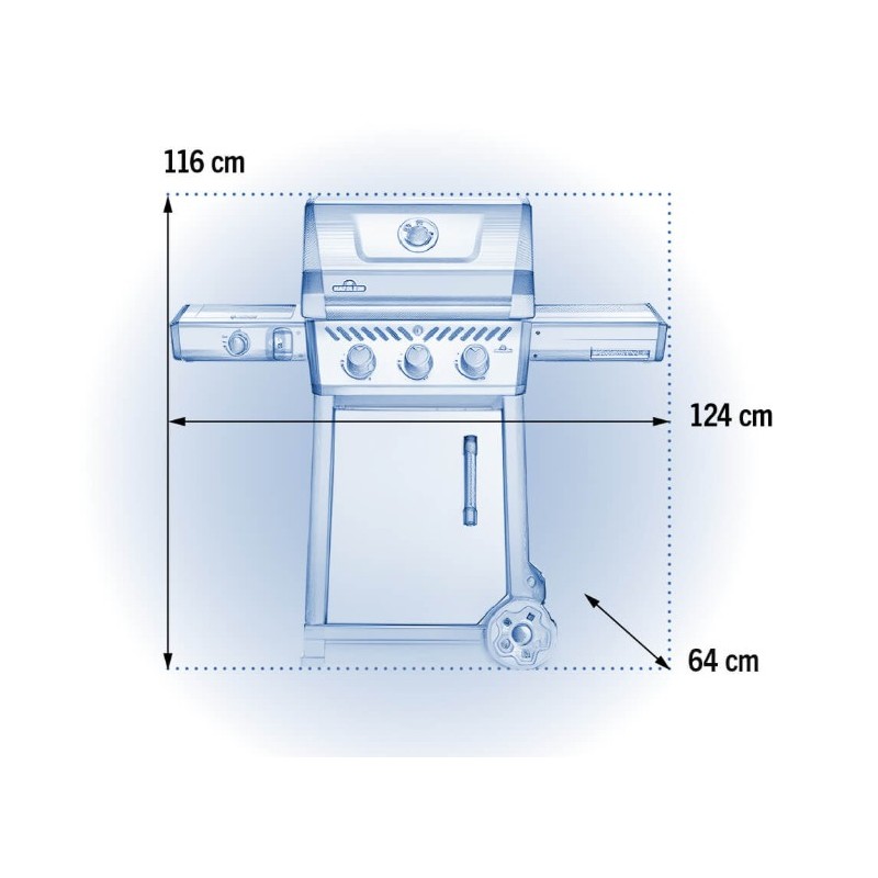 - 15 kW con 3 quemadores principales y 3210 cm² de superficie total de parrilla.