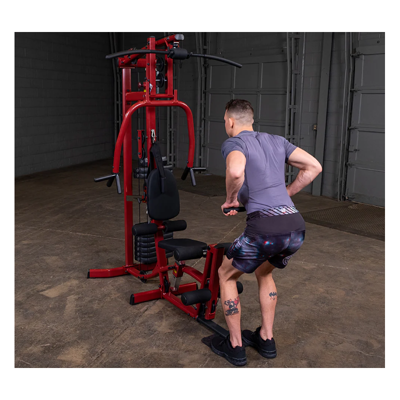 Este gimnasio Best Fitness es un gimnasio en casa con cinco estaciones de entrenamiento de prensas múltiples, tirón lateral / polea alta, abdominales / polea media, extensión de piernas / flexión de piernas y remo de sentado/polea baja.
