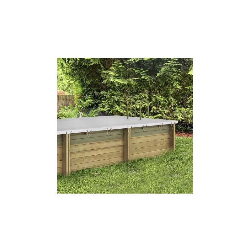 Para una adherencia óptima de su cubierta a la piscina, está diseñada para extenderse al menos 10 cm alrededor del perímetro de la piscina, incluida la coronación, y se fija debajo del bordillo (en la pared de madera de la piscina) gracias a cuerdas elásticas individuales y ganchos de acero inoxidable; los ojales son de PVC gris.