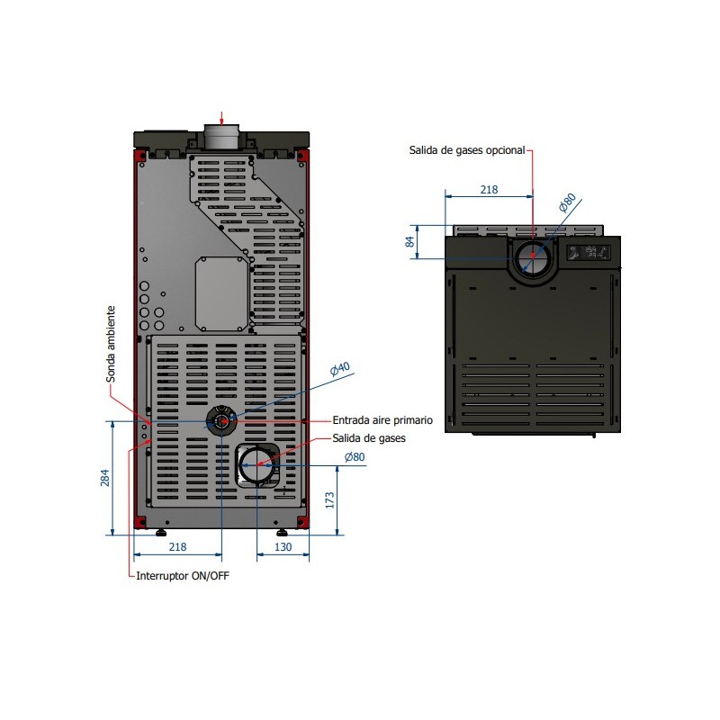 Conexión de gases de combustión de Ø80 mm en la parte trasera o en la parte superior