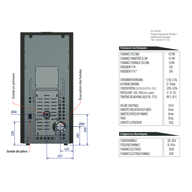 ESCALOR. Potencia 4.6kW a 14.7kW - Eficiencia máxima 92% - Volumen máximo de calefacción recomendado 375m3 - Autonomía hasta 30h - Programador y control remoto proporcionado - Capacidad 30kg - Pantalla digital - Imperial Rojo y Negro.