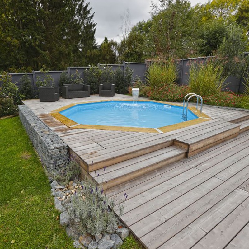 Piscina de madera Ubbink Océa 510 de forma octogonal. Se entrega como un kit completo que incluye estructura, filtración y accesorios.