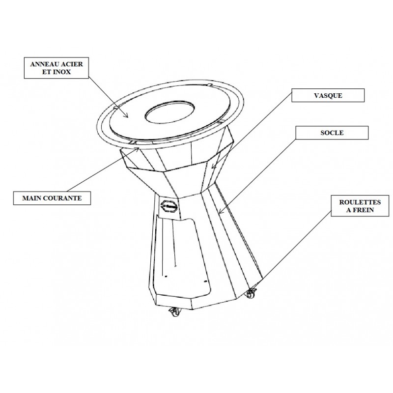 Brasero (base y lavabo) con el 4 ruedas montadas y el anillo acero y acero inoxidable con pasamanos.