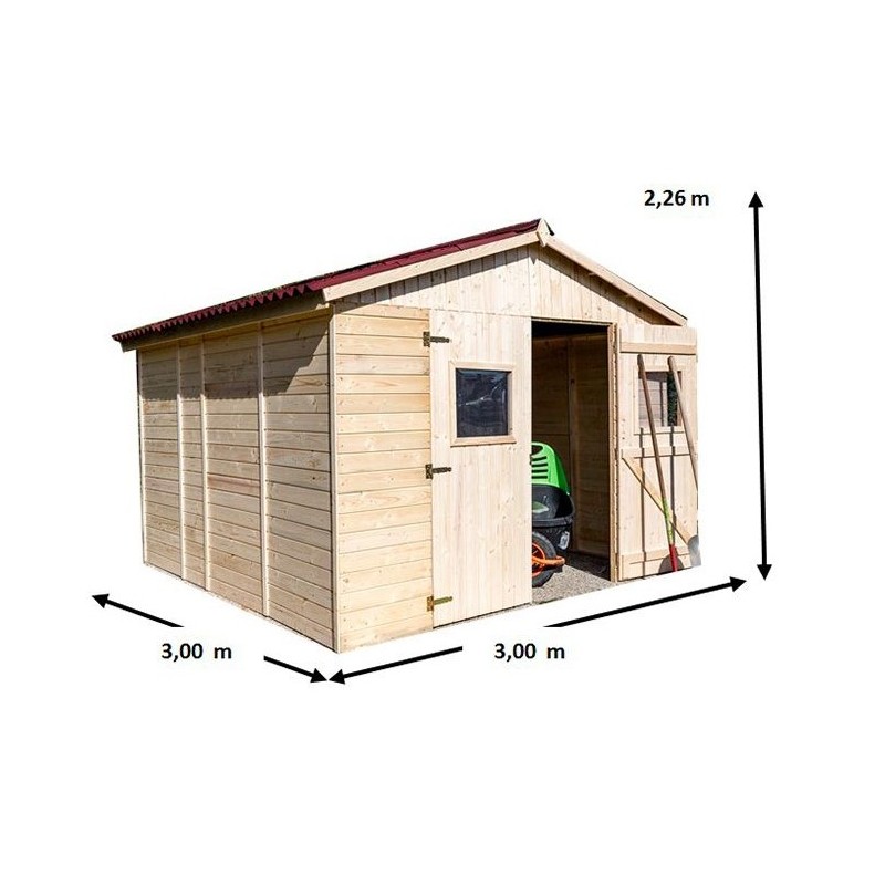 Este cobertizo de jardín de madera se entrega como un kit y tendrá que ser ensamblado por usted. Con unas dimensiones exteriores de 3 x 3 m, ocupará una superficie de 9 m². Su espacio interior de 7,62 m² le permitirá jugar, almacenar equipos de jardinería o cualquier otro equipo al aire libre. Este cobertizo de jardín está garantizado por 2 años.
