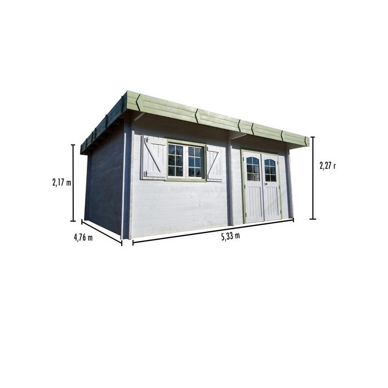 El cobertizo refugio de un superficie exterior (total) de 25,37m² con su techo plano es un producto muy hermoso, que combina el encanto de una construcción de madera cruda y la funcionalidad de un gran espacio abierto.