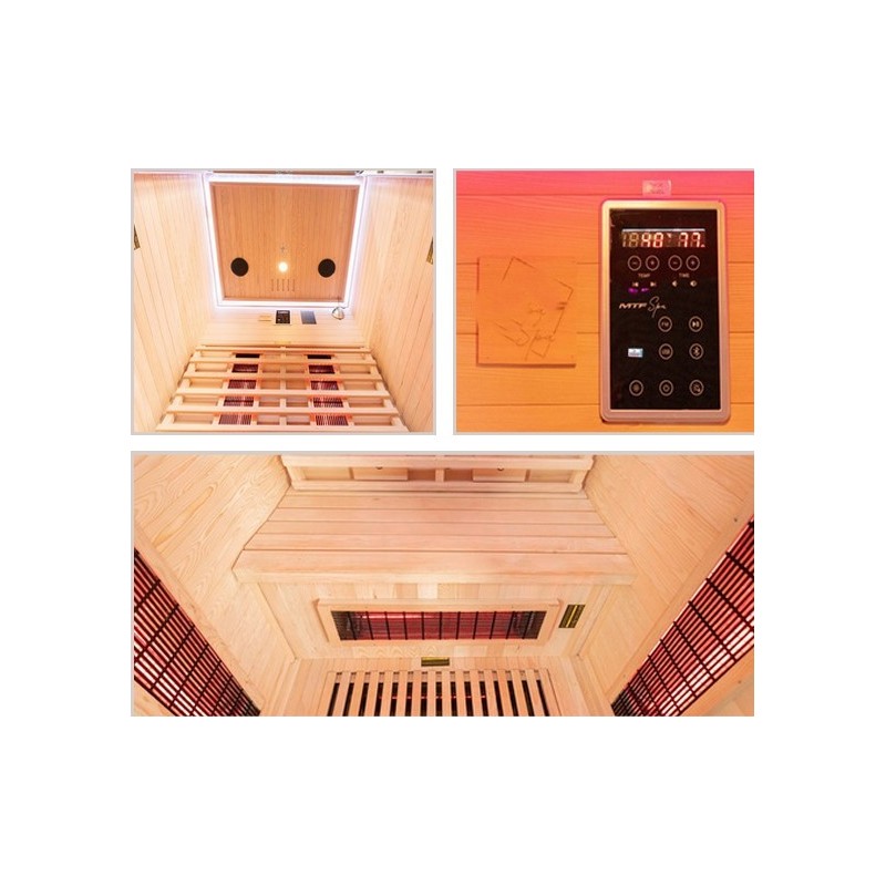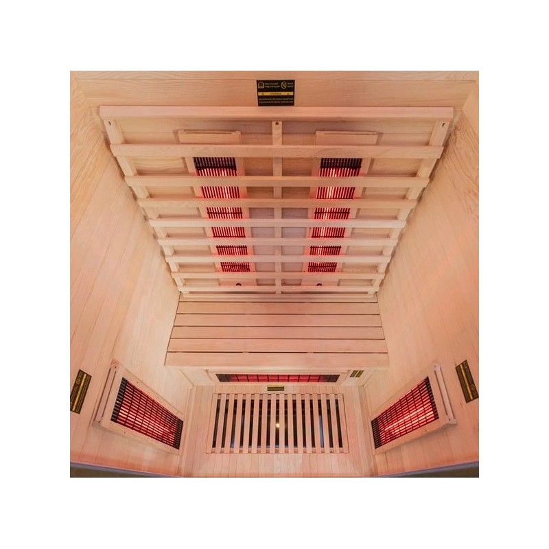 Sauna de infrarrojos VerySpas con tecnología Infrared Duo 2 plazas en madera de abeto para disfrutar de un espacio arrullado por el calor reconfortante de los paneles cerámicos.