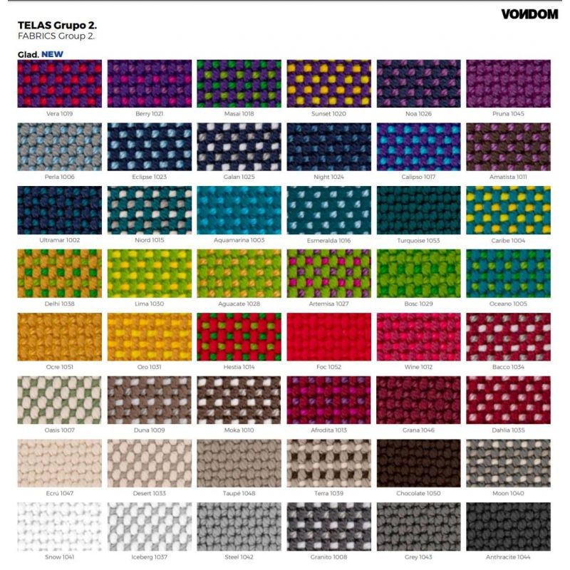Material: Espuma de poliuretano. Tejido alegre en polipropileno suave. Estructura de acero tratada por cataforesis y pies de aluminio.
