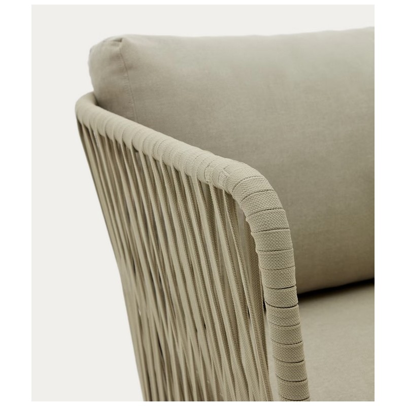 El trenzado de cuerda de los reposabrazos y el respaldo suaviza su apariencia general, para un equilibrio perfecto entre modernidad y convivencia.
