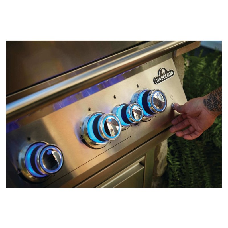 - Les boutons de commande ergonomiques et rétroéclairés ajoutent une touche d'ambiance et de sécurité, diffusant une magnifique lueur bleue qui passe au rouge lorsque les brûleurs sont utilisés. Ajoutez à cela l'éclairage halogène intérieur qui illumine votre surface de cuisson pour vous offrir le plaisir de cuisiner en soirée.