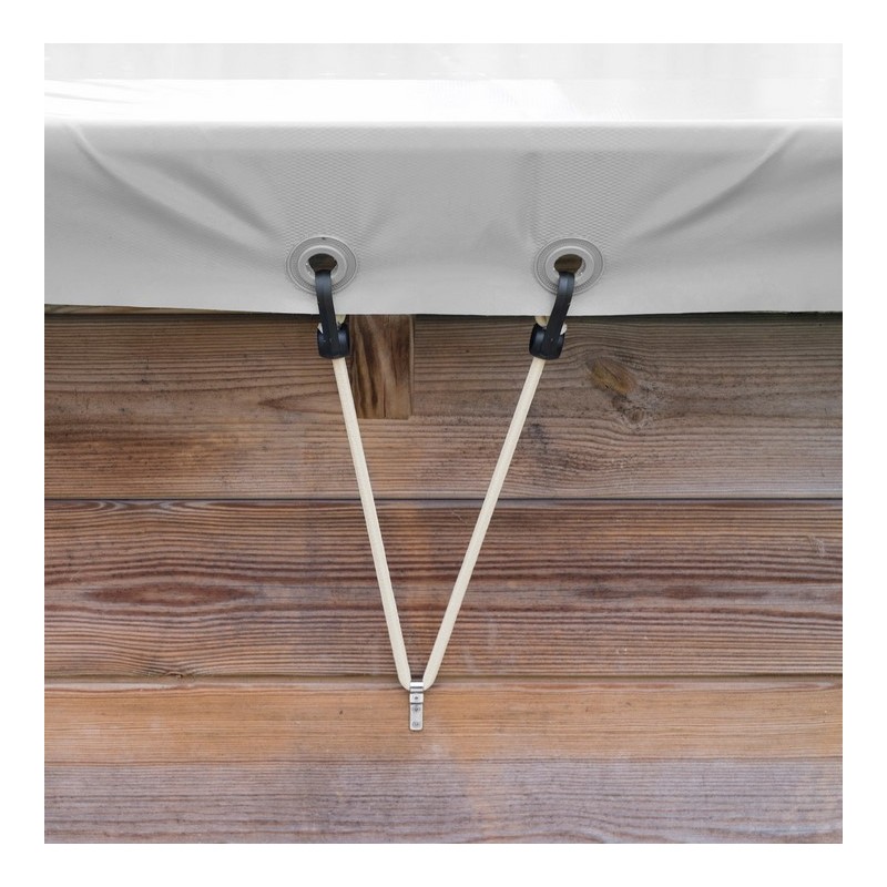 Pour une adhérence optimale de votre couverture au bassin, elle est prévue pour déborder de 10 cm minimum sur le pourtour de la piscine, margelle comprise, et se fixe sous la margelle (sur la paroi en bois de la piscine) grâce à des sandows individuels et des crochets en inox ; les œillets sont en PVC gris.