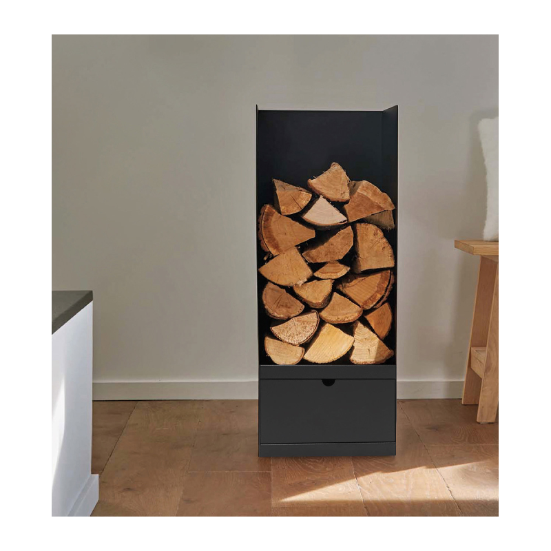 Tiroir intégré pour faciliter le rangement des petits accessoires : allumettes, allume-feux, journaux, ou petit bois.