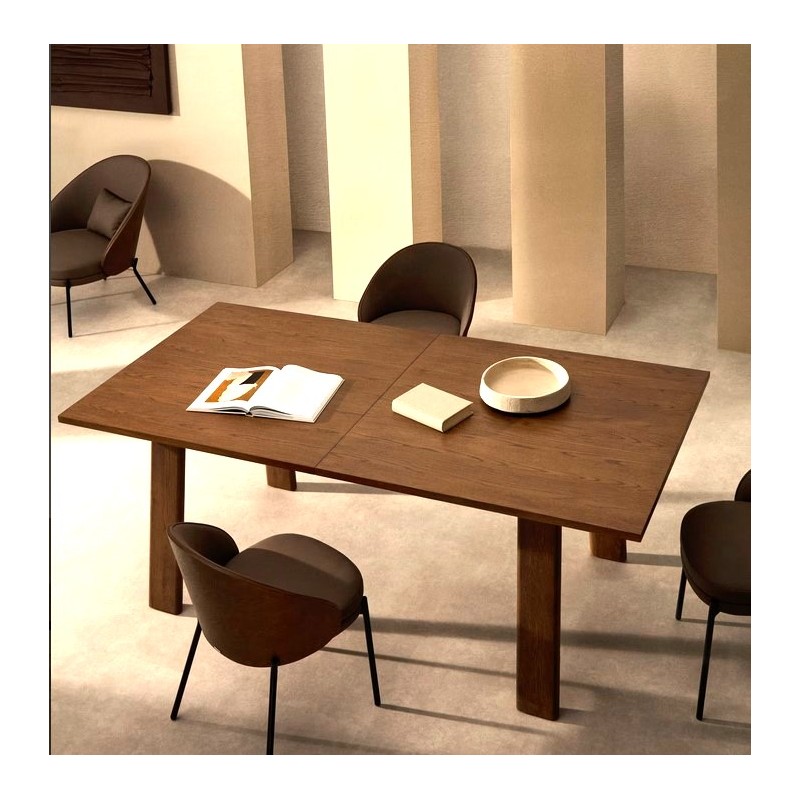 Table Rectangle extensible avec plateau en contreplaqué de chêne et pieds en bois massif avec rallonges de 250cm maximum.