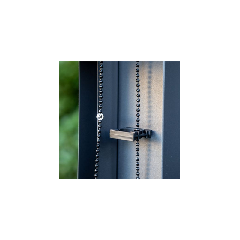 Le store latéral se déroule facilement à la hauteur d’occultation souhaitée grâce à une chaînette et au système de guidage latéral.