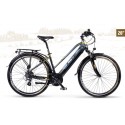 Vélo de randonnée à assistance électrique pour femme avec un moteur Bafang dans le moyeu arrière et un axe de selle à ressort adapté aux longs trajets sur les pistes cyclables et les routes avec batterie intégrée signés Samsung.L'équipement est complet pour la conduite de loisir, et une autonomie max de 200 km.