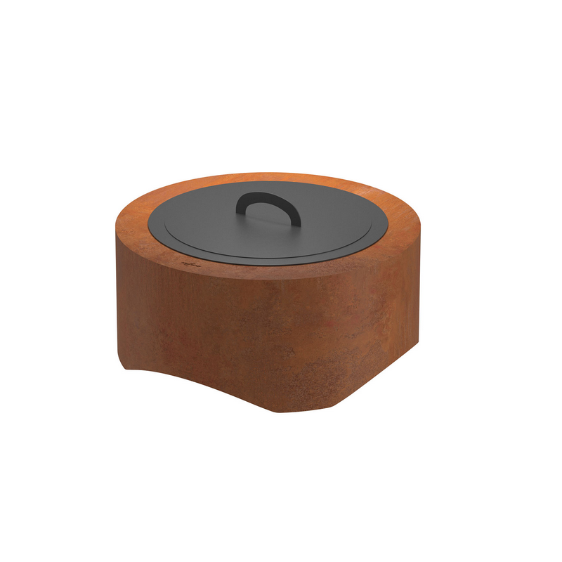 Il set comprende il braciere in acciaio corten, l'inserto focolare in acciaio spessore 3 mm verniciato con una speciale vernice ignifuga di colore nero e il coperchio nero.