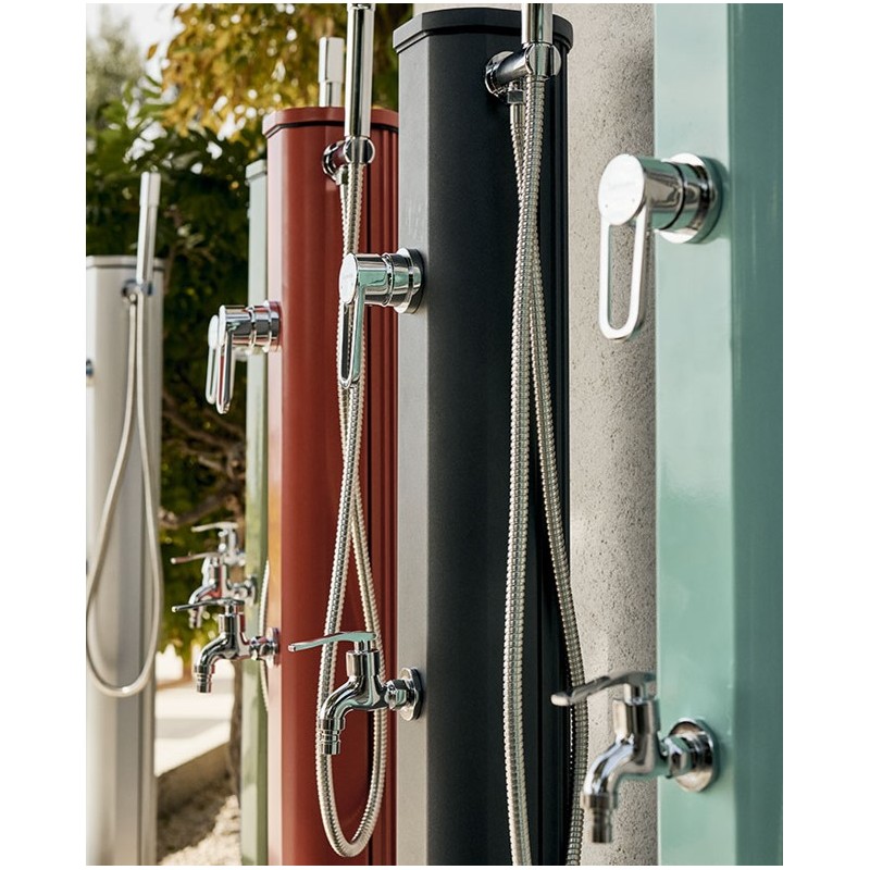 Pratico, elegante ed ecologico, Jolly Go in alluminio per una discreta doccia solare con una capacità di 20L con risciacquo piedi, per il tuo giardino o la tua piscina.