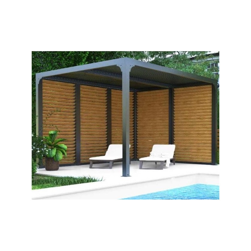 Al fine di ottimizzare il vostro comfort, la pergola bioclimatica è dotata di un set di 2 pannelli laterali con ventose rimovibili per uno dei lati di 3m in legno imitazione alluminio.