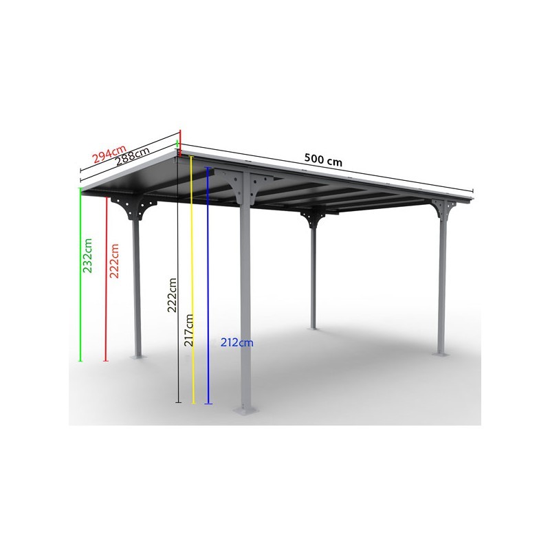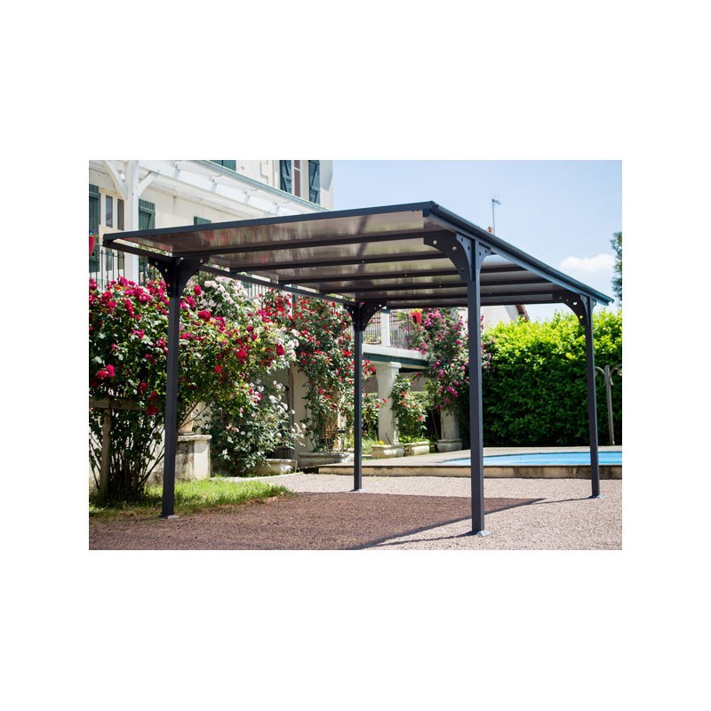 I quattro montanti in alluminio devono essere fissati a terra (su fondazioni in borchie o lastre di cemento) con piastre di ancoraggio in dotazione. Il tetto composto da lastre in policarbonato di ultima generazione lascia intravedere la luce e riduce la trasmissione del calore. Beneficia di un trattamento contro i raggi ultravioletti.