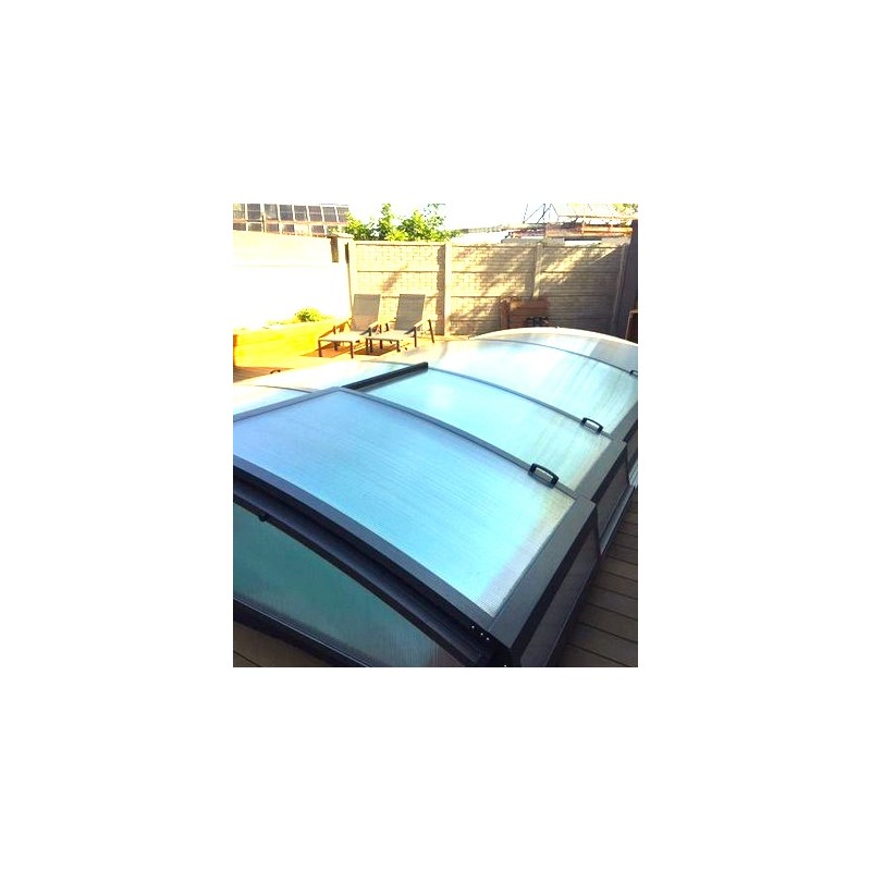 Você escolhe sua largura, de um mínimo de 3,50 m e até um máximo de 6 m, o Abrigo Imperial Médio-alto A piscina telescópica adapta-se à sua piscina de 4,3 a 17,02 metros de comprimento. E uma altura máxima de 1,55m.