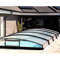 Muito manobrável com deslizamento sobre rodas, o abrigo telescópico dos termas pode ser facilmente aberto ou fechado e permite total liberdade à volta da piscina.