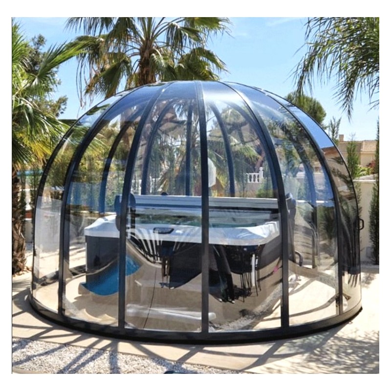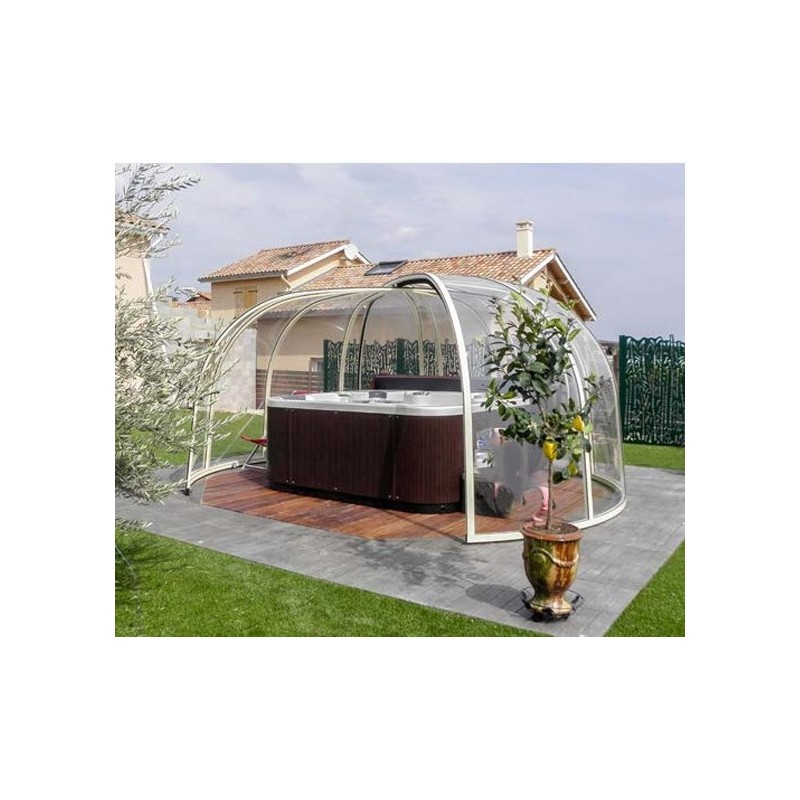 Este espaço móvel com um diâmetro de 3,74 m e uma altura de 2,30 m Formado por folhas de painéis transparentes de policarbonato de 3 mm para uma vista panorâmica do seu spa.