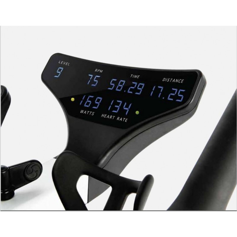O console estilo cockpit, projetado estrategicamente com uma tela de alta visibilidade (LED) indica seu tempo, distância percorrida, potência em watts e frequência cardíaca, uma visão geral rápida do seu progresso durante o seu treinamento.
