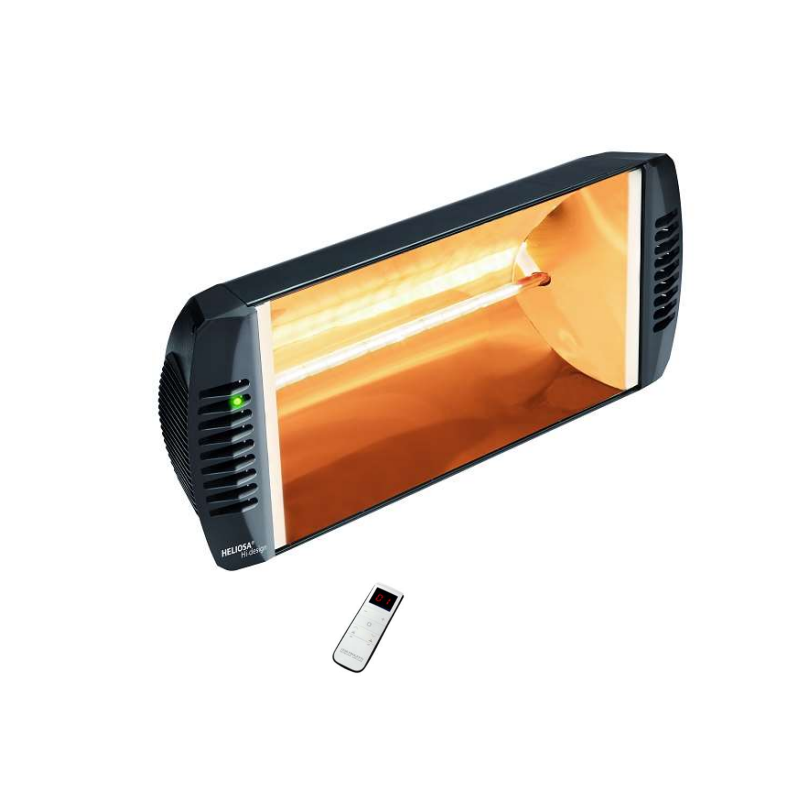 Heliosa Hi Design Wide 2000W aquecedor radiante em alumínio fundido preto. Modelo grande angular montado na parede com controle remoto via rádio com memória para uso interno e externo permite aquecimento de uma área de até 20m².