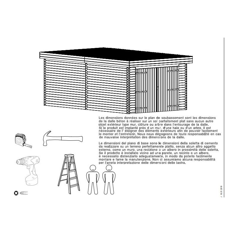 Não monte seu galpão de jardim diretamente no gramado ou no solo. Manutenção: aplique um óleo de saturador ou madeira para preservar a cor interior e exterior imediatamente após o montagem.