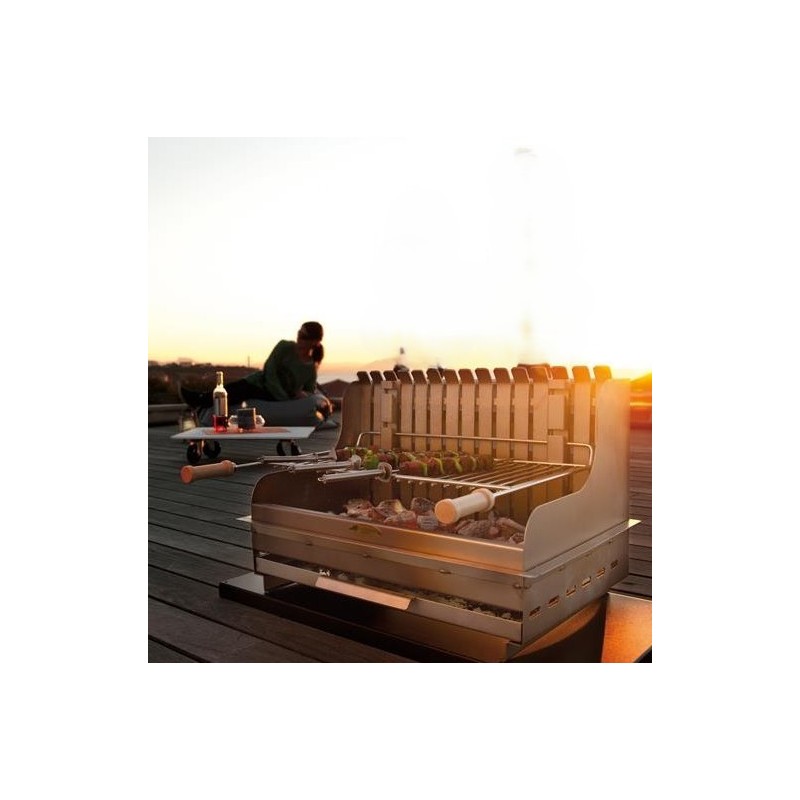 Churrasco O artilheiro Mendy Carvão embutido em aço inoxidável que resiste à corrosão, intempéries, maresia e é fácil de manter. A grelha 54x32 pode ser integrada num suporte ou carrinho para desfrutar de forma fácil e harmoniosa da sua cozinha exterior.