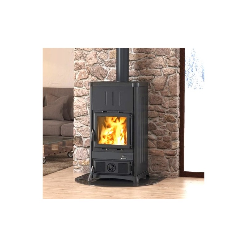O fogão a lenha Fedora da La Nordica é feito de ferro fundido com revestimento de aço. Com uma potência nominal de 8,3 kW que permite aquecer cerca de 238m3.
