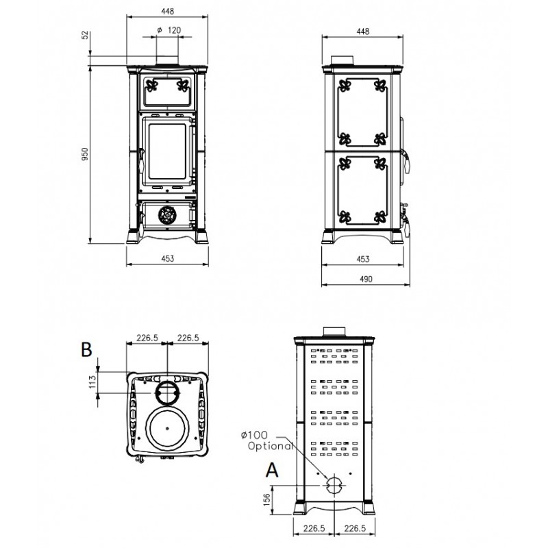 O fogão a lenha Emília da marca La Nordica é feita de ferro fundido com um revestimento cerâmico. Com uma potência nominal de 6,5 kW que pode aquecer cerca de 186m3.