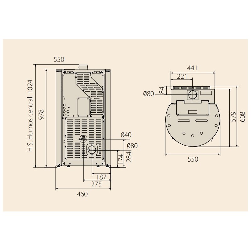 Conexão de fumaça: 80 mm traseiro (vertical opcional a pedido)