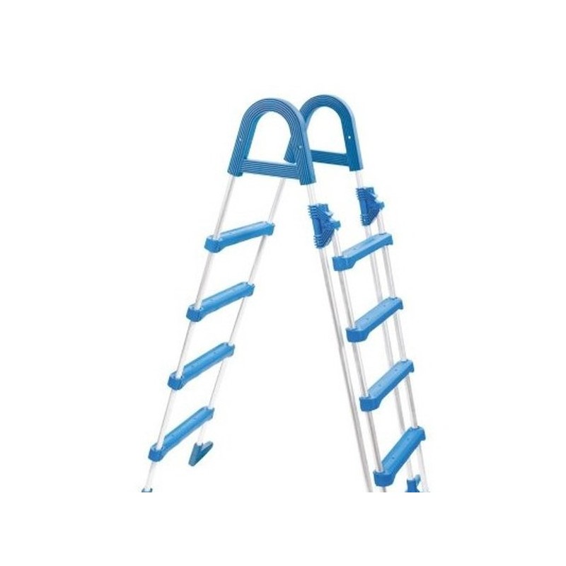 Escada: Escala de segurança. É feito de aço galvanizado e laqueado em branco com 6 passos e frente removível. (Isso permite que as etapas sejam desmontadas do lado externo para evitar que as crianças acessem a piscina e evitem acidentes).