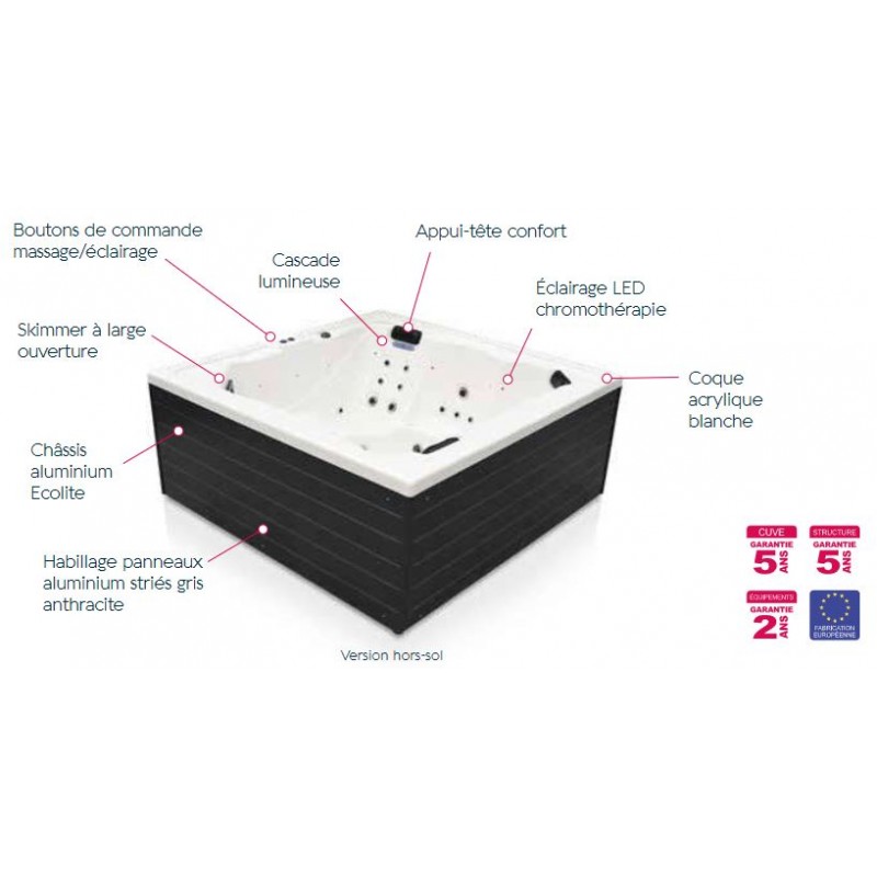 As cores influenciam nosso estado físico e psíquico pela visão, mas também pelo corpo que reage aos comprimentos de onda de cada cor. Com a cascata de luz LED multicolorida, escolha a cor da água do seu spa com base no seu estado de espírito e experiência sensorial desejada.